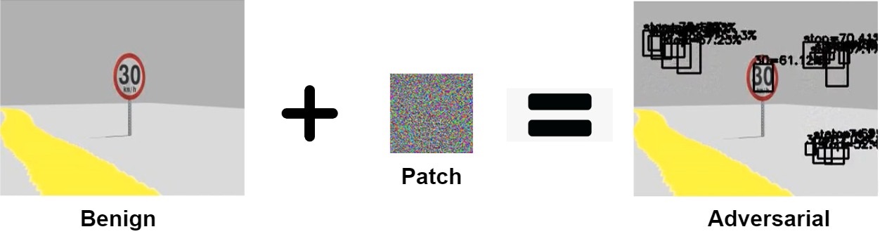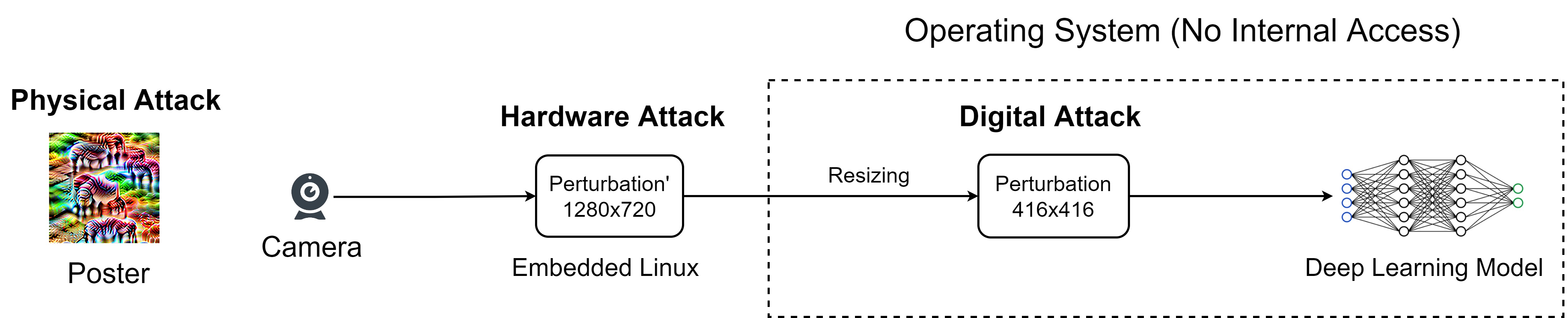 In the next step, to apply the perturbation, prior research introduced digital attack and physical attack. The digital attack requires access to the operating system, but hacking into the operating system is not trivial. The physical attack can print the perturbation on a poster, but the poster needs to be placed close to the camera. This is challenging for robotic applications in dynamic environments.