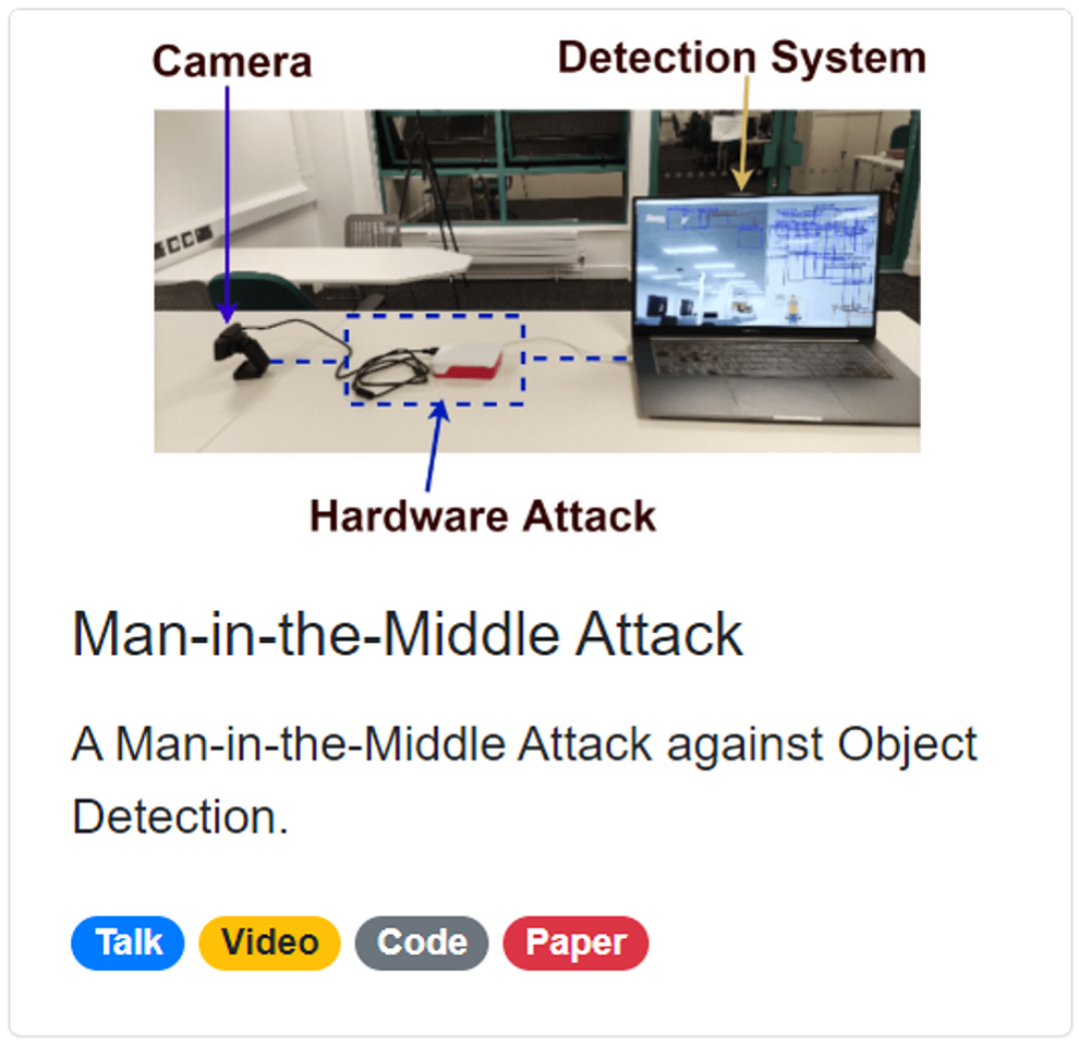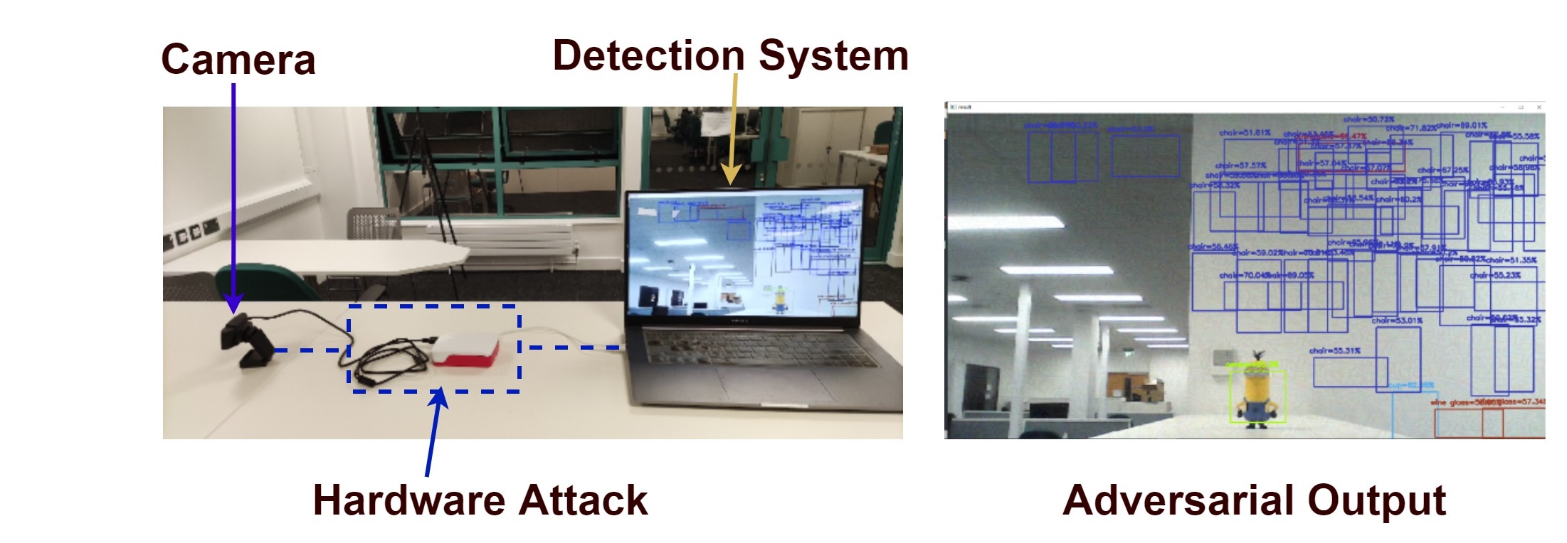 Here's a quick demo. We have a USB camera and a detection system. We used a raspberry pi version 4 to inject the perturbation. The raspberry pi reads the image from the USB camera, injects the perturbation, and then simulates a virtual camera to the detection system. The detection system has no idea that the image is manipulated.
