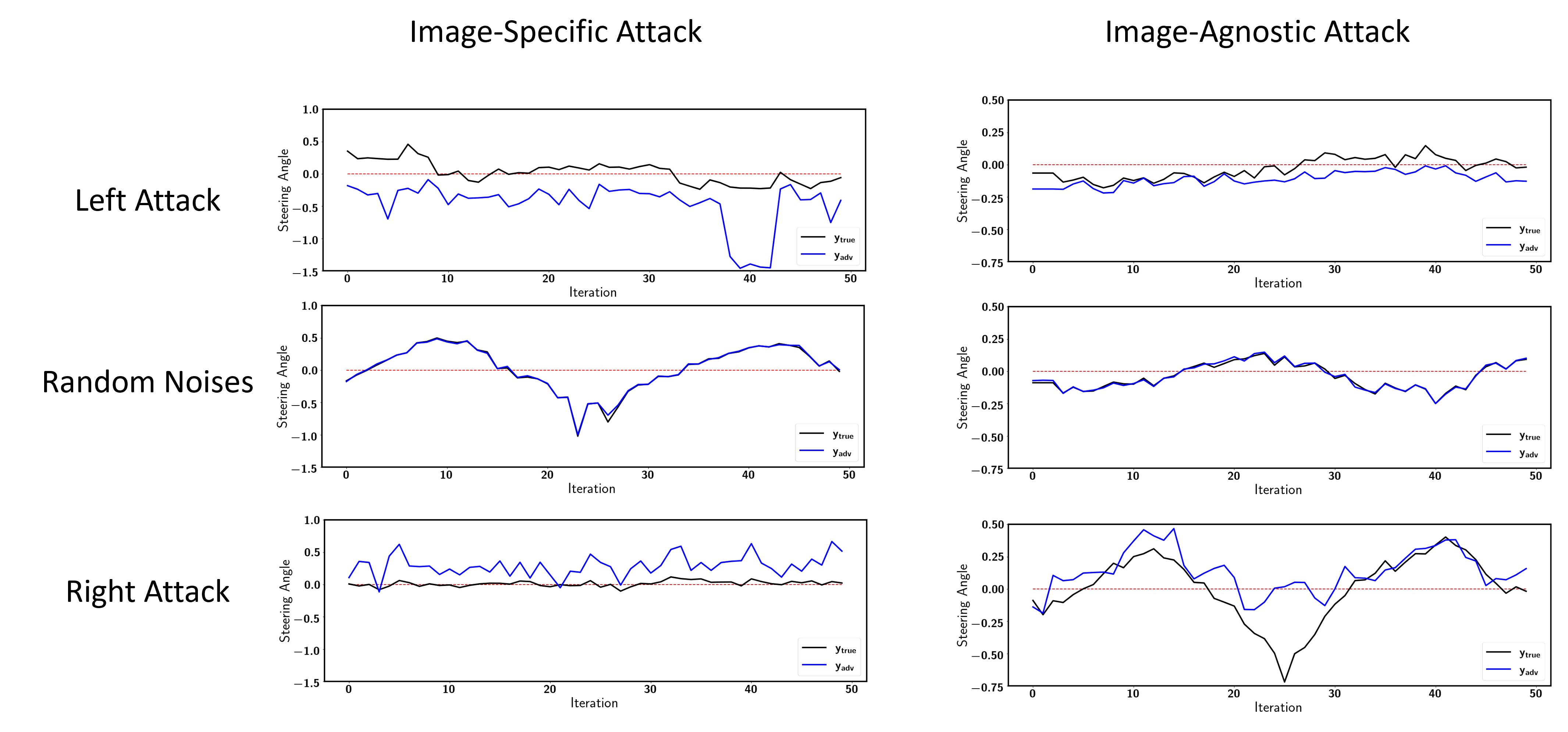 The image-specfic attack generates adversarial perturbations for each input image. This is a very strong attack. As you can see here, the vehicle gets out of control immediately after applying the adversarial perturbations.
