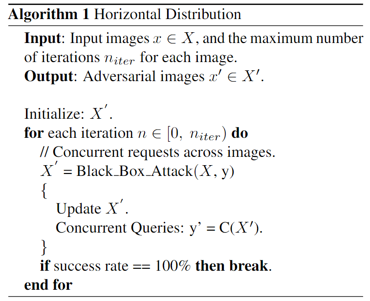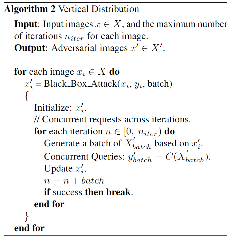 On the other side, vertical distribution sends out concurrent queries across iterations for the same image. For each image, we generate multiple adversarial perturbations and send out queries concurrently across iterations.