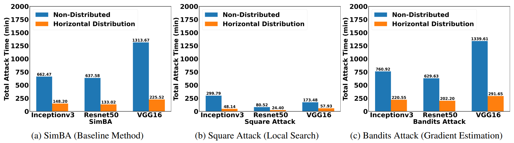 Furthermore, we design two general frameworks, horizontal and vertical distribution, that can be applied to existing black-box attacks to reduce the total attack time. (5 min)