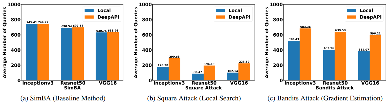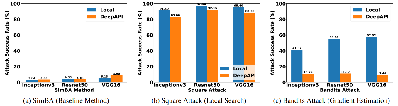 Our experimental results demonstrate that attacking Cloud APIs is more challenging than attacking local models. For local search and gradient estimation methods, attacking cloud APIs achieve less success rate than attacking local models. In our experiments, we limit the number of queries for each image to be at most 1,000, which is quite challenging. As a result, the baseline method only achieves a success rate of roughly 5%.