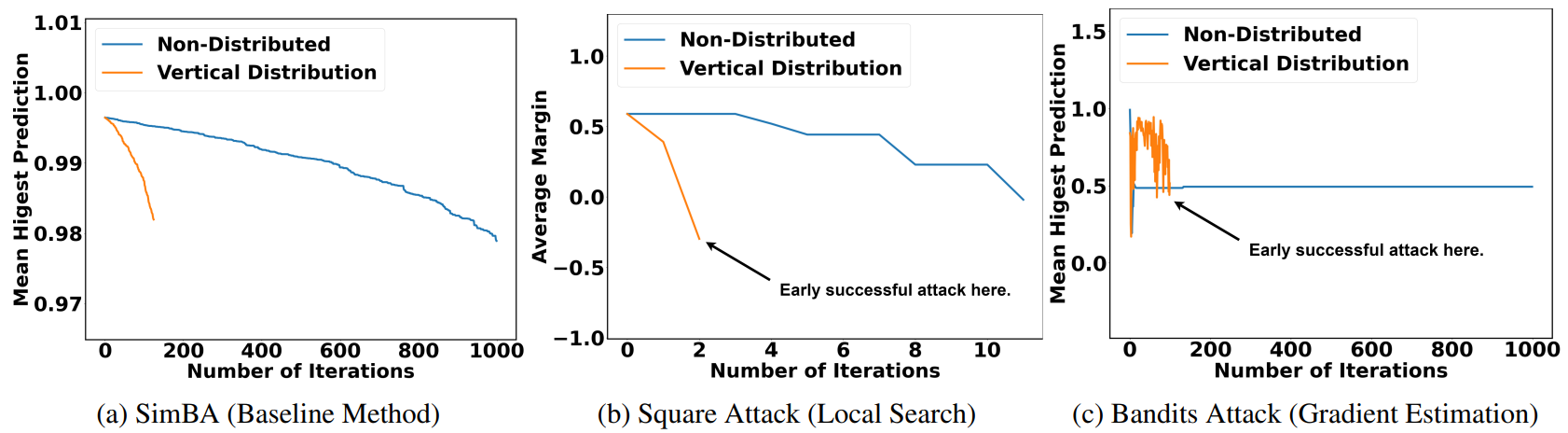 After applying vertical distribution, besides reducing the attack time, both local search and gradient estimation methods achieve early successful attacks. The probability of the original predicted class drops faster.